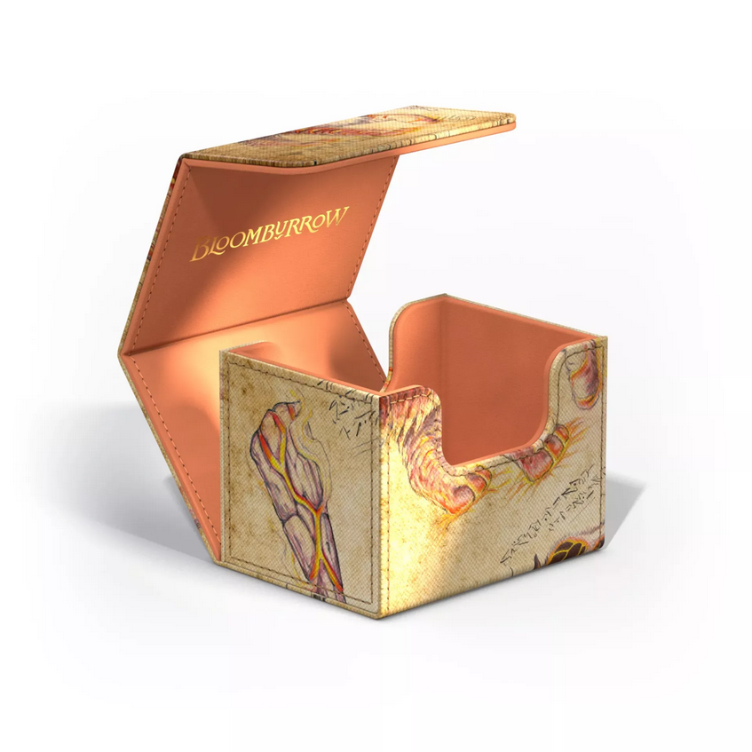 The Sunspine Lynx deck box opened up, showing how the box opens and revealing a golden Bloomburrow logo